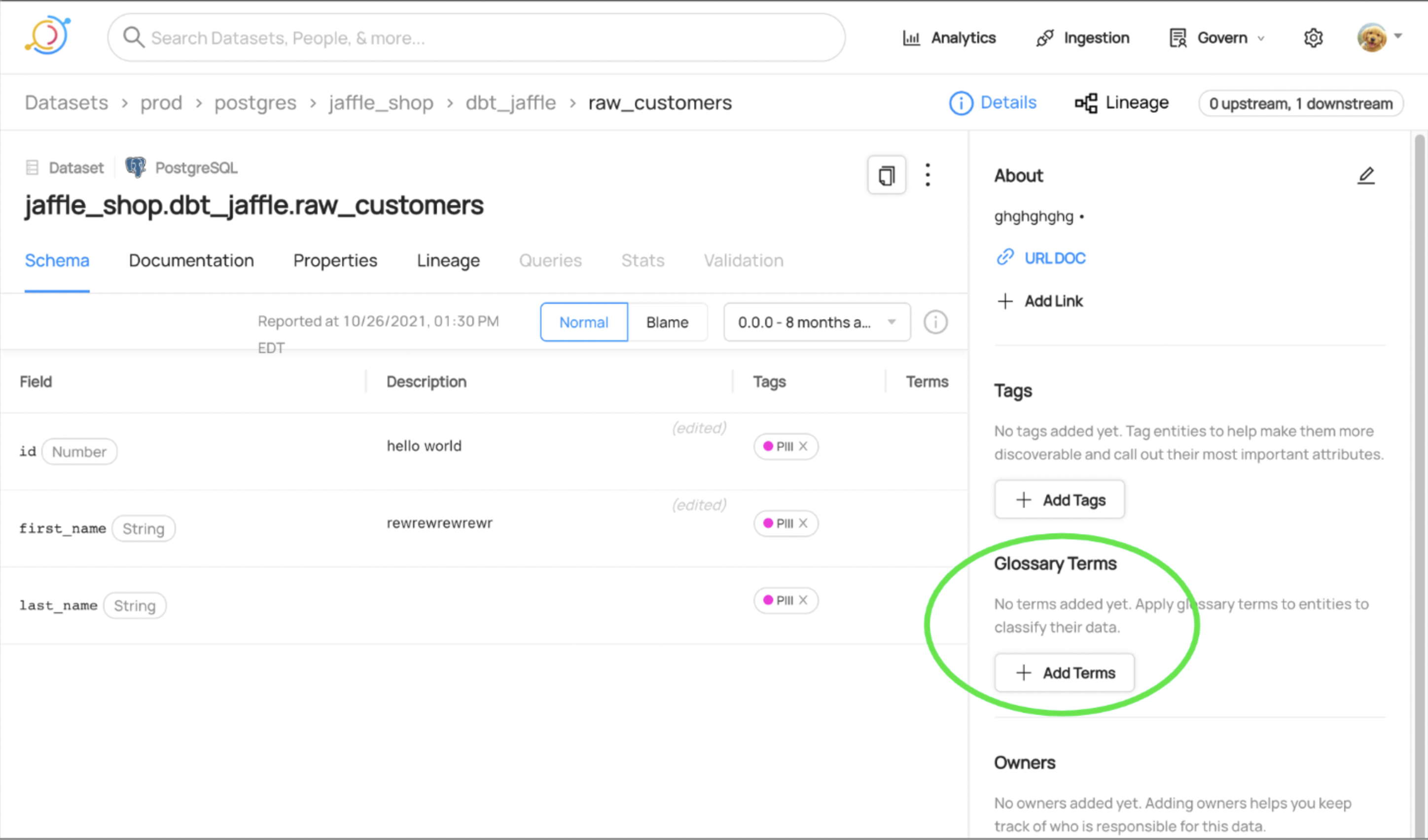 Once you've defined your Glossary, you can begin attaching terms to data assets. To add a Glossary Term to an asset, go to the entity page of your asset and find the Add Terms button on the right sidebar.