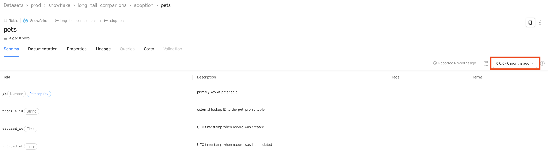 You can view the Schema History for a Dataset by navigating to that Dataset's Schema Tab. As long as that Dataset has more than one version, you can view what a Dataset looked like at any given version by using the version selector. Here's an example from DataHub's official Demo environment with the Snowflake pets dataset.